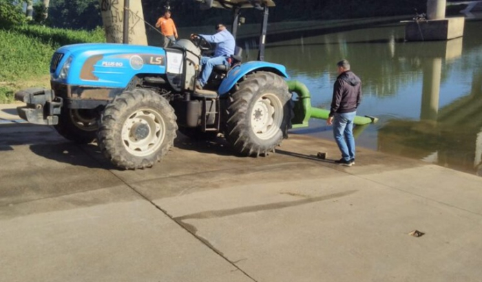 Bomba provisória a ser colocada no local terá sua força motriz disposta por um trator agrícola - Foto: Divulgação As equipes da Secretaria de Proteção e Defesa Civil realizaram nesta terça-feira, 06 de maio, o teste operacional necessário da bomba motorizada, na rampa náutica no Bairro Dehon.