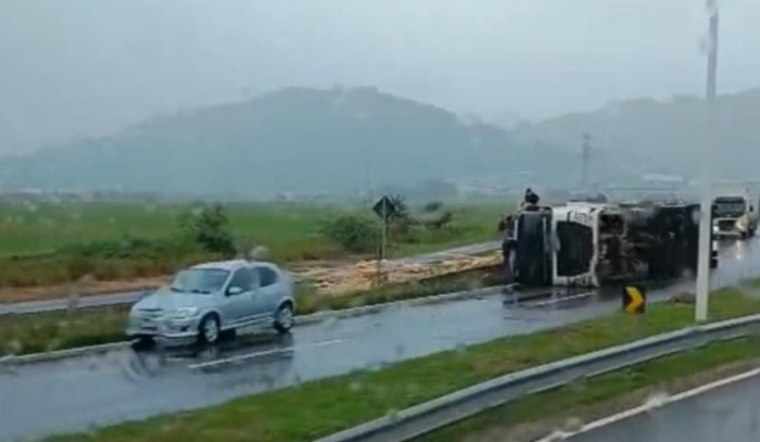 A Polícia Militar Rodoviária (PMRv) atua na ocorrência - Foto: Divulgação O tombamento de um caminhão provocou a interdição de uma faixa da Rodovia ivane Fretta Moreira, em Tubarão, nesta quinta-feira, 22 de maio.