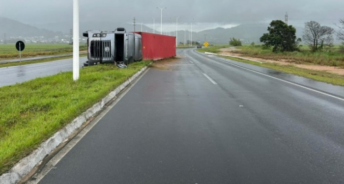 Uma carreta tombou na rodovia Ivane Fretta Moreira, na SC-370, em Tubarão, na tarde desta terça-feira, 31 de outubro. Para a Polícia Militar Rodoviária (PMRv), o motorista, de 22 anos, afirmou que perdeu o controle do veículo e o caminhão acabou tombando.