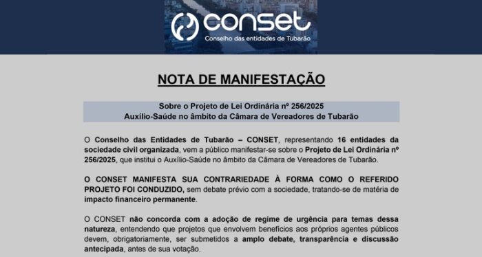 Conset avalia que o modelo adotado não foi o mais adequado - Foto: Reprodução O Conselho das Entidades de Tubarão (Conset), que representa 16 entidades da sociedade civil organizada, divulgou uma nota de manifestação na última segunda-feira, 22 de dezembro, sobre o Projeto de Lei Ordinária nº 256/2025, que institui o Auxílio-Saúde no âmbito da Câmara de Vereadores de Tubarão.