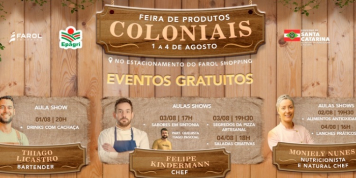 Produtos coloniais frescos direto do produtor serão os destaques da 17ª edição da feira - Foto: Divulgação A 17ª edição da Feira de Produtos Coloniais, promovida pela Epagri e o Farol Shopping, acontecerá entre os dias 1 a 4 de agosto no estacionamento do piso térreo do Farol Shopping em Tubarão.