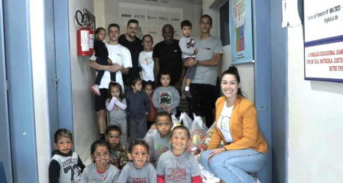 Entrega de doações na Fundação Educacional Joana de Ângelis - Foto: Divulgação A terceira edição do Futebol Solidário de Tubarão foi um verdadeiro sucesso, e mais de 3 mil torcedores prestigiaram a partida que reuniu artistas nacionais e estrelas do mundo esportivo em prol da solidariedade.