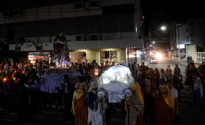 Durante o cortejo, as imagens do Senhor Morto e de Nossa Senhora das Dores partiram da praça da Catedral. Com velas acesas, os fiéis acompanharam o trajeto tradicional, iluminando o percurso e reforçando o clima de fé e reflexão.