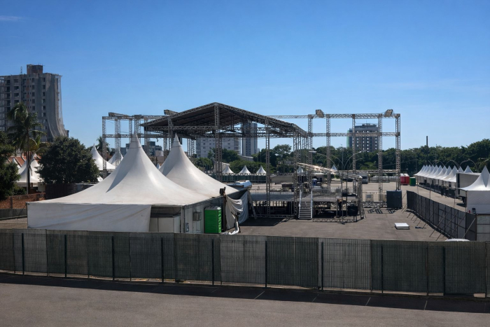 Equipes trabalham desde a última segunda-feira, na instalação do palco, estruturas metálicas, tendas e áreas de circulação que irão compor o espaço do evento. A montagem mostra a dimensão do espetáculo, considerado um dos maiores shows já realizados recentemente na cidade.