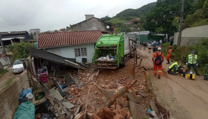 A prefeitura de Tubarão apura as circunstâncias do acidente que teria envolvido falha no sistema de frenagem do veículo - Foto: Divulgação Um motorista de caminhão de lixo invadiu uma residência e ficou preso às ferragens no Bairro São Martinho, em Tubarão.