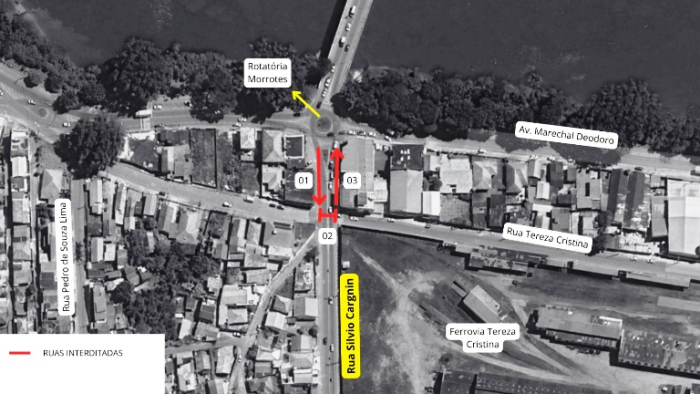 O acesso para a rotatória do Morrotes, será pelas ruas Tereza Cristina, Ferroviários e Avenida Marechal Deodoro.