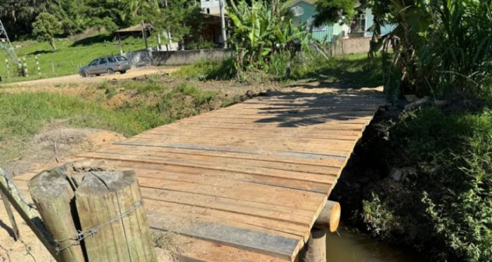 a ponte de madeira também é utilizada para a travessia de pequenos rebanhos diversos - Foto: Divulgação A Prefeitura, por meio da Secretaria de Proteção e Defesa Civil e da Secretaria de Agricultura e Interior, retomou nesta quarta-feira, 31 de janeiro, a reconstrução de um pontilhão de madeira sobre um canal secundário na localidade do Km 60. A estrutura é destinada à passagem de pedestres, ciclistas e motocicletas.