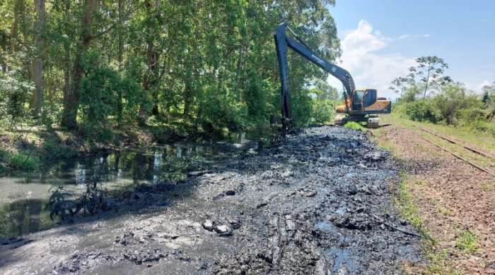 Com o auxílio de uma escavadeira hidráulica a ação se concentra em desobstruir o curso-d’água da cidade a fim de evitar possíveis alagamentos ou outras complicações.