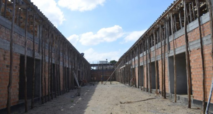 Nesta segunda-feira, 11 de março, os operários do canteiro de obras trabalhavam em diversos acabamentos da parte da alvenaria do térreo e, também, nas caixarias das estruturas que serão concretadas para receber a cobertura.