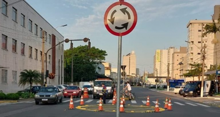 Com isso, o conjunto de semáforos que durante anos funcionou no cruzamento será removido. A rotatória definitiva terá o mesmo material utilizado no período de testes, com tachões formando o círculo com as faixas na cor amarela.