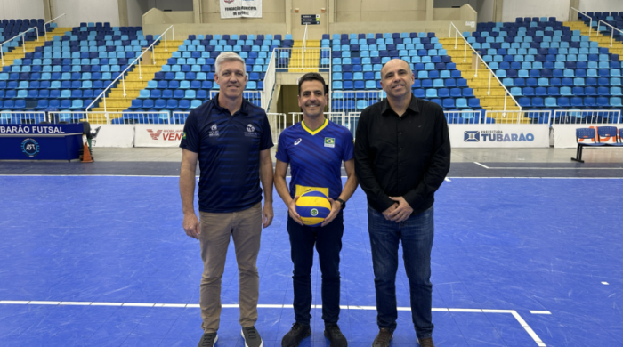 O prefeito e o presidente da federação visitaram, ainda, as instalações da arena, ao lado do diretor-presidente da Fundação Municipal de Esporte - Foto: Divulgação O prefeito Estêner Soratto recebeu na última quarta-feira, 18 de junho, a visita do presidente da Federação Catarinense de Voleibol, Fernando Faquin, quando foi oficializado o amistoso internacional entre Brasil e Coreia do Sul, com suas seleções de novos.