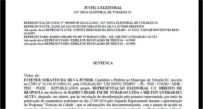 A decisão foi assinada no dia 12 de novembro e protocolada na última terça-feira, 19 de novembro - Foto: Reprodução O Tribunal Regional Eleitoral de Santa Catarina (TRE) condenou a Rádio Cidade de Tubarão e o radialista Milton Guimarães Alves ao pagamento de multa de R$ 10 mil – R$ 5 mil cada.