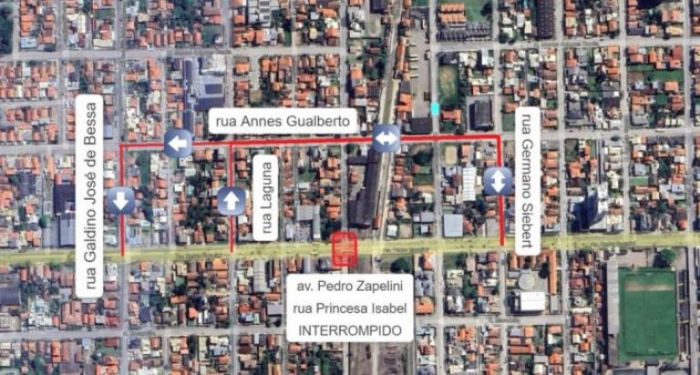 Ao trafegar no sentido da Avenida Pedro Zapelini para Oficinas, os motoristas deverão entrar à direita na Rua Germano Siebert e poderão retornar a avenida pela Rua Galdino José de Bessa.