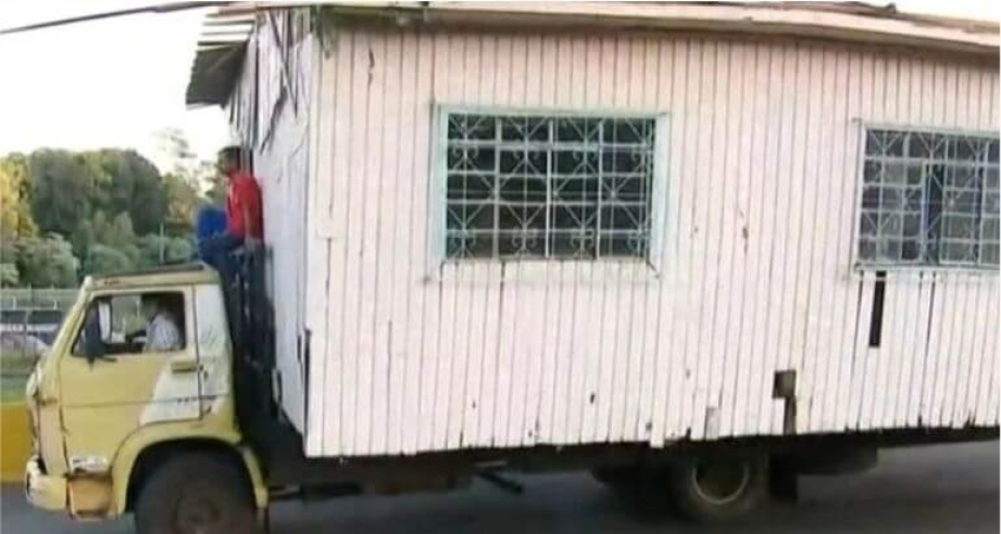 É possível ver um homem sentado no teto do caminhão, apoiado na casa, enquanto ela é transportada. O momento aconteceu às 7h da manhã, na Avenida Atílio Fontana e foi capturado pela NSC TV.