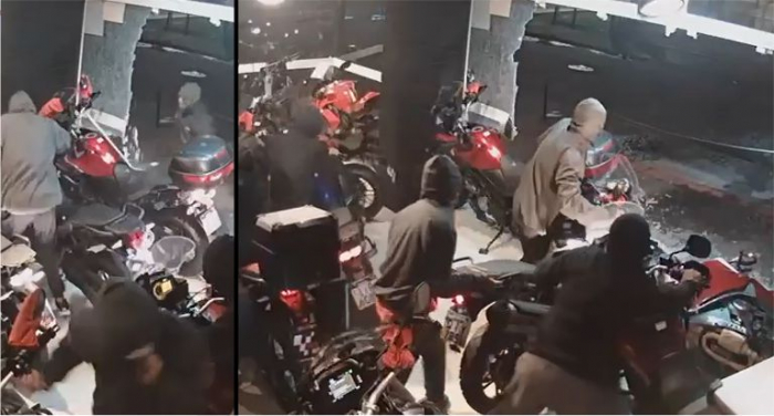 Era 2h49 quando eles quebraram as vidraças. Durante o roubo eles conseguiram levar aparentemente quatro motocicletas, que estavam no salão da empresa.