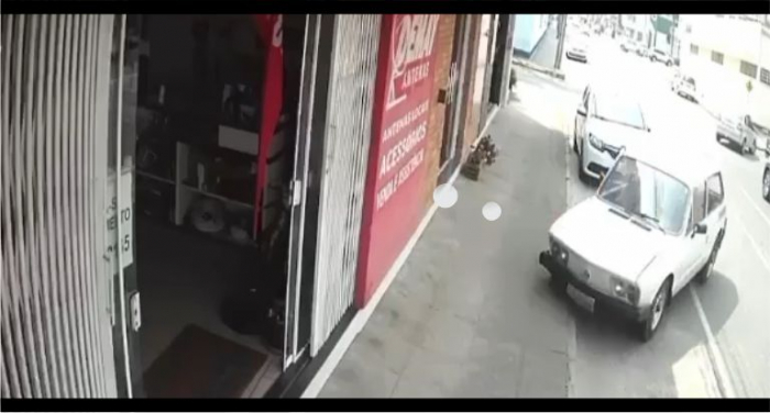 O momento da colisão foi gravado pelas câmeras externas de Video monitoramento da empresa Demay Antenas – local que foi atingido por um Volksvagen Brasilia.
