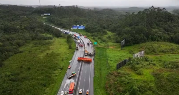 O acidente, envolvendo três caminhões no total, deixa a rodovia totalmente interditada em ambos os sentidos. Uma pessoa ficou ferida e foi levada para o hospital. Não há previsão de liberação da rodovia.