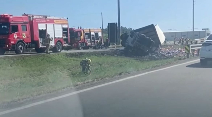 Com o impacto, a carga ficou espalhada pela via, provocando o bloqueio total da pista no sentido norte. Imagens que circulam nas redes sociais mostram parte do carregamento espalhado e equipes atuando no atendimento da ocorrência.