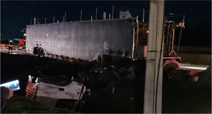 No trajeto, o tráfego foi reduzido para uma faixa de pista - Foto: Reprodução/Revista Única Um acidente de trânsito mobiliza equipes de segurança na noite desta terça-feira, 12 de novembro. Um caminhão-cegonha caiu da ponte que liga os municípios de Tubarão e Capivari de Baixo, no KM-328, no sentido Norte da BR-101.