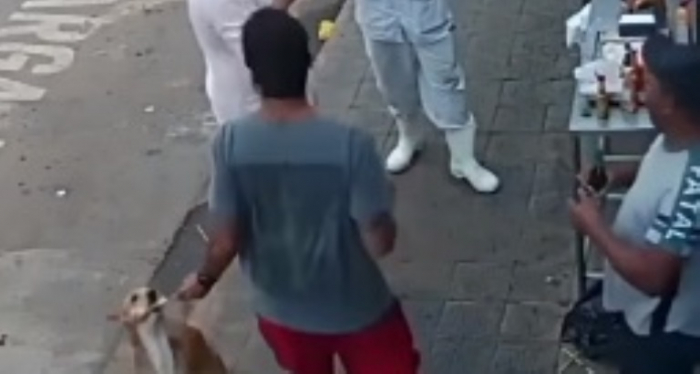 O cão aproveitou um momento de distração e furtou a comida. A ação do animal provocou risadas do grupo que estava na barraquinha de churrasco e deixou o cliente incrédulo. Tudo foi registrado por uma câmera de segurança de um açougue.