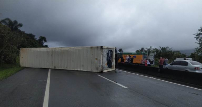 Duas vítimas sofreram ferimentos leves - Foto: Divulgação Duas carretas tombaram na tarde desta sexta-feira, 03 de novembro, e interditou nos dois sentidos a BR-101 em Biguaçu. O acidente que deixou um semirreboque em cada lado da pista ocorreu no km 184. Não há previsão de liberação.