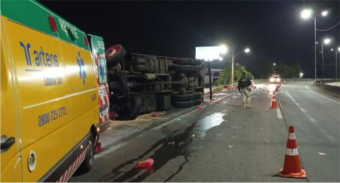 A causa provável da colisão foi o sono ao volante - Foto: Divulgação/PRF Um caminhão carregado com 15 toneladas de cerveja tombou na BR-101 em Biguaçu, na Grande Florianópolis, nesta segunda-feira, 12 de fevereiro.