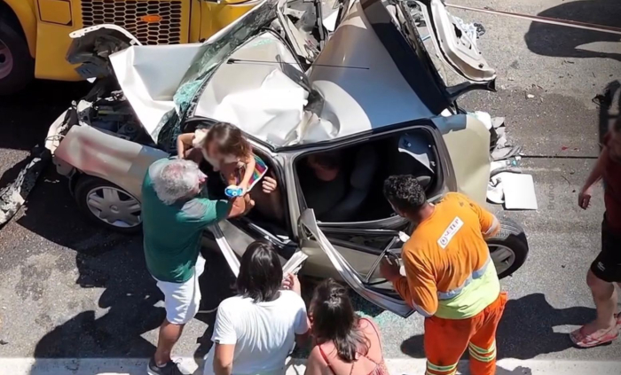 A colisão traseira ocorreu em Garopaba - Foto: Divulgação Imagens captadas por um drone registraram momentos após um grave acidente envolvendo uma carreta, três carros e um micro-ônibus escolar no km 260 da BR-101, em Garopaba. A colisão no sentido Sul ocorreu no início da tarde desta quinta-feira, 26 de março. De dentro de um veículo quase irreconhecível, populares ajudaram a retirar uma criança e um homem.