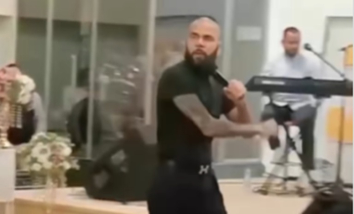 O momento gerou debate entre internautas - Foto: Reprodução O ex-jogador Daniel Alves reapareceu publicamente durante um culto evangélico na cidade de Girona, na região da Catalunha, na Espanha, após ter passado aproximadamente 14 meses preso.