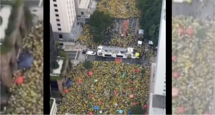 O ato pela democracia corre especialmente nas proximidades do Museu de Arte de São Paulo (Masp) - Foto: Reproduçãi/Redes Sociais Imagens aéreas mostram a concentração de manifestantes, na Avenida Paulista, durante a tarde deste domingo, 25 de fevereiro. O ato pela democracia corre especialmente nas proximidades do Museu de Arte de São Paulo (Masp).