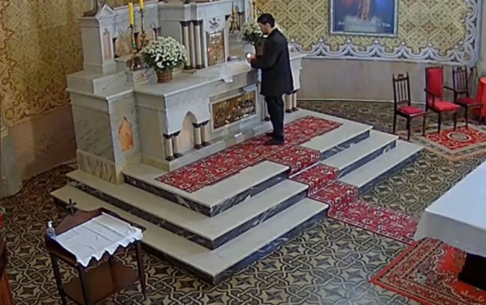Além de invadir o espaço religioso, o homem acendeu um explosivo no altar. Imagens de uma câmera de segurança flagraram a ação ocorrida na última quarta-feira, 30 de julho.