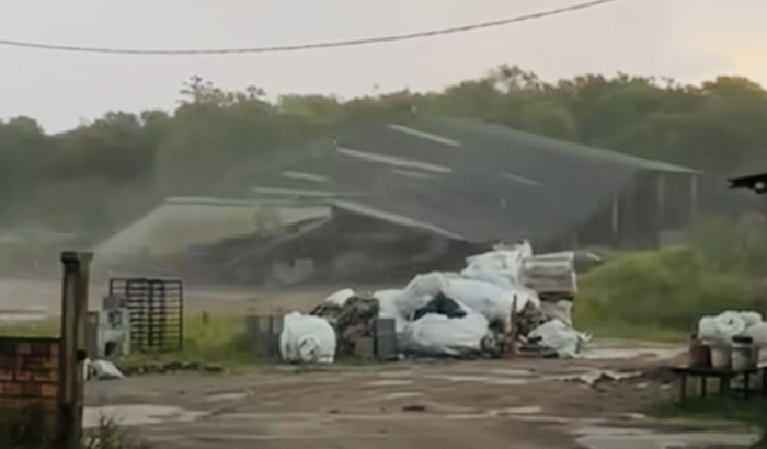Nas imagens registradas por testemunhas, é possível ver o momento em que um galpão é implodido pela força do vento, na região da comunidade de Morro Grande, de acordo com informações apuradas.