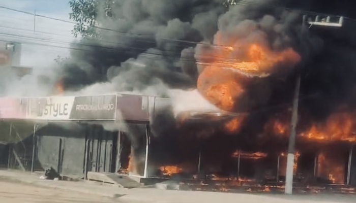 Desde às 7h, um incêndio de grandes proporções consome uma loja de roupas, nas imediações da rótula do Quartel, na Avenida Marcolino Martins Cabral, no Bairro Passagem. A estrutura ficou totalmente destruída.