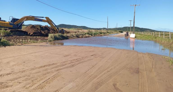 Há trechos alagados, após as sucessivas chuvas dos últimos dias, e muita lama. Na tarde desta segunda-feira, 20 de maio, uma máquina de propriedade particular é usada para tentar escoar a água acumulada sobre a pista.