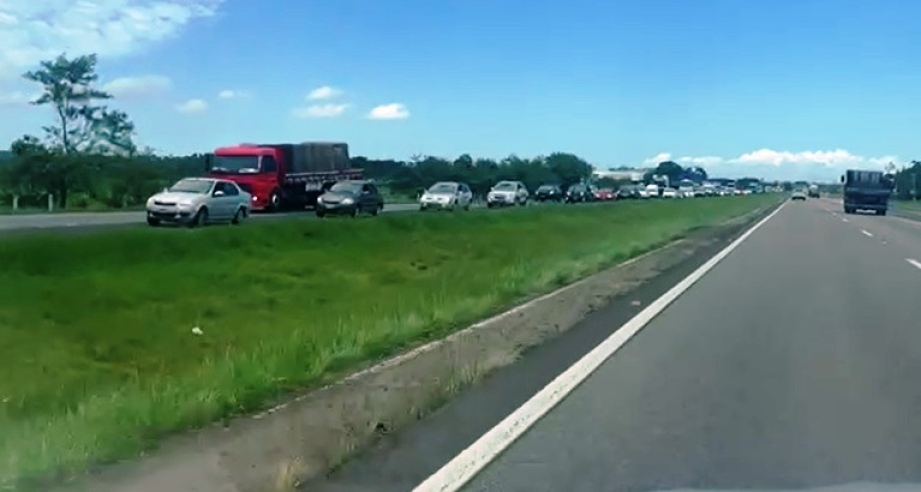 Foto/Vídeo: Fabiano Bordignon Desde a noite da última terça-feira, 03, uma van tombada na marginal do canteiro central da BR-101 provoca lentidão na altura do trevo de Içara, no sentido Sul/Norte. Nesta quarta-feira, 04, a pista central segue bloqueada com cones no trecho e a formação de fila já chegava a cinco quilômetros até Balneário Esplanada, às 13h.