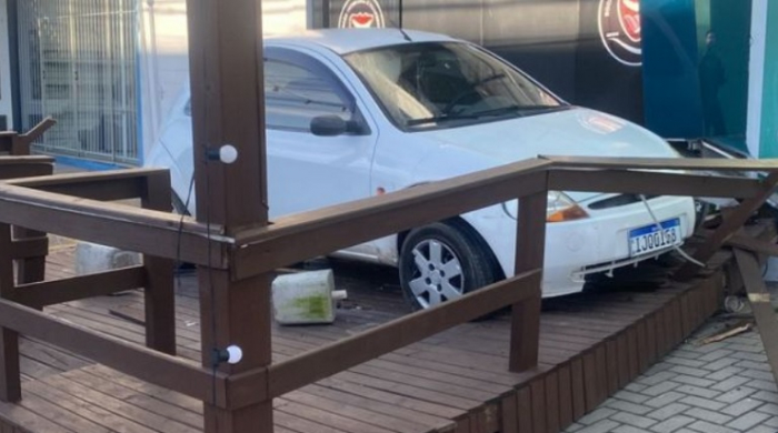 Ninguém se feriu no acidente - Foto: Reprodução Nesta sexta-feira, 19 de abril, uma lanchonete teve sua área externa invadida por um carro desgovernado na Avenida Patrício Lima, em Tubarão.