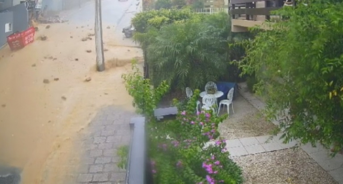 O caso foi registrado por uma câmera de monitoramento - Foto: Reprodução A forte chuva que atingiu Tubarão no final da tarde do útimo sábado, 16 de março, provocou a queda de um muro na Rua Conselheiro Mafra, no limite entre o Centro e Bairro Vila a Moema.