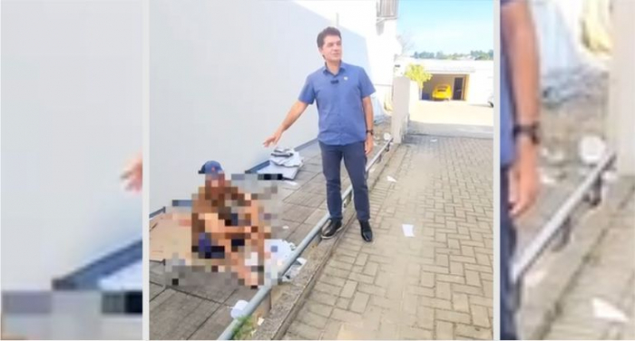 Salvaro sugeriu ainda que ele tomasse um banho - Foto: Reprodução O prefeito de Criciúma, Clésio Salvaro (PSD), durante fiscalização em obras, encontrou um morador de rua visivelmente embriagado.
