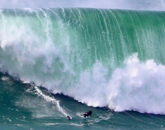 Momento da queda do surfista que foi seguida de série de ondas gigantes - Foto: Bred Oliveira O surfista de Ondas Grandes, Thiago Jacaré, de Jaguaruna, enfrentou momentos tensos após perder o equilíbrio e cair no mar em Nazaré, Portugal, nesta semana. O atleta submergiu ao atravessar uma grande massa de água ao atravessar a onda e apareceu novamente na superfície quando quase foi resgatado pelo surfista português, Sérgio Cósmico, que estava com jetski.